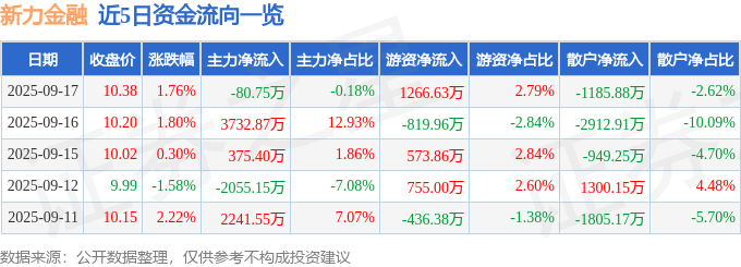 证券之星消息,截至2025年9月17日收盘,新力金融(600318)报收于10.38元,上涨1.76%,换手率8.55%,成交量43.82万手,成交额4.53亿元。