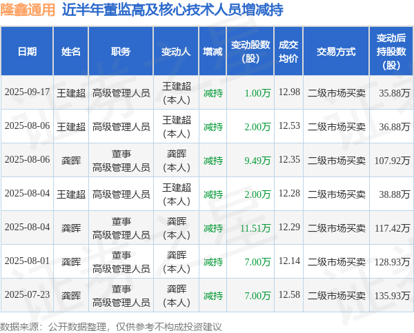 隆鑫通用近半年内的董监高及核心技术人员增减持详情如下: