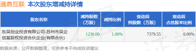 证券之星消息,9月17日通鼎互联发布公告《通鼎互联:关于持股5%以上股东减持股份达到1%的公告》,其股东东吴创业投资有限公司-苏州市吴企创基股权投资合伙企业(有限合伙)于2025年9月2日至2025年9月16日间合计减持1230.0万股,占公司目前总股本的1.0%,变动期间该股股价上涨12.77%,截止9月16日收盘报6.36元。