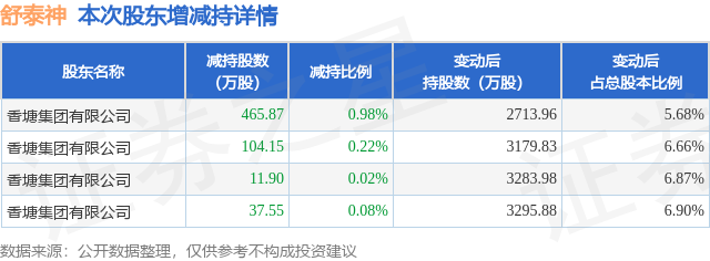 证券之星消息,9月17日舒泰神发布公告《舒泰神:关于持股5%以上股东减持股份触及1%整数倍暨减持计划实施完毕的公告》,其股东香塘集团有限公司于2025年9月10日至2025年9月16日间合计减持619.47万股,占公司目前总股本的1.2966%,变动期间该股股价下跌0.7%,截止9月16日收盘报38.14元。