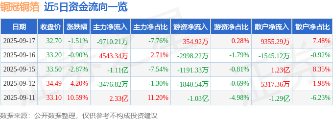 证券之星消息,截至2025年9月17日收盘,铜冠铜箔(301217)报收于32.7元,下跌1.51%,换手率4.55%,成交量37.73万手,成交额12.51亿元。