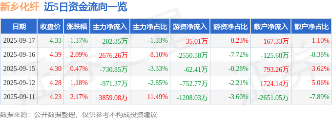 证券之星消息,截至2025年9月17日收盘,新乡化纤(000949)报收于4.33元,下跌1.37%,换手率2.06%,成交量34.99万手,成交额1.52亿元。
