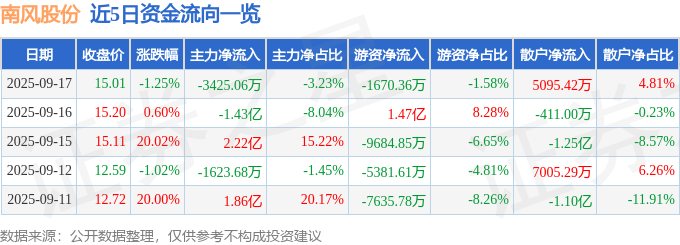 证券之星消息,截至2025年9月17日收盘,南风股份(300004)报收于15.01元,下跌1.25%,换手率14.93%,成交量71.65万手,成交额10.59亿元。