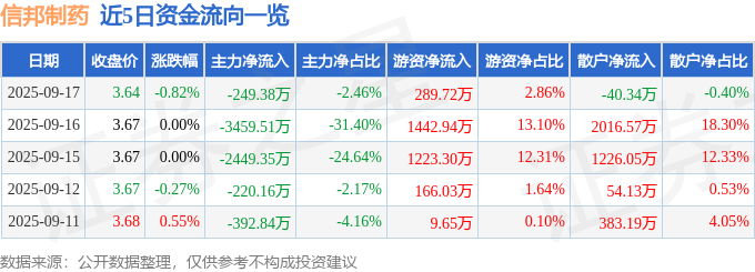 证券之星消息,截至2025年9月17日收盘,信邦制药(002390)报收于3.64元,下跌0.82%,换手率1.44%,成交量27.76万手,成交额1.01亿元。
