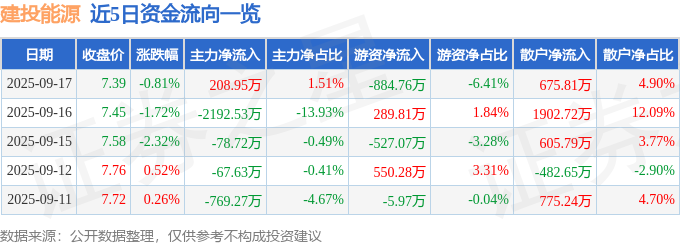 证券之星消息,截至2025年9月17日收盘,建投能源(000600)报收于7.39元,下跌0.81%,换手率1.71%,成交量18.69万手,成交额1.38亿元。