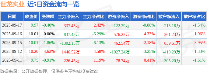 证券之星消息,截至2025年9月17日收盘,世龙实业(002748)报收于9.97元,下跌0.4%,换手率5.82%,成交量13.97万手,成交额1.4亿元。