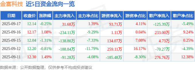 9月17日的资金流向数据方面,主力资金净流入31.68万元,占总成交额1.39%,游资资金净流入93.71万元,占总成交额4.11%,散户资金净流出125.39万元,占总成交额5.49%。