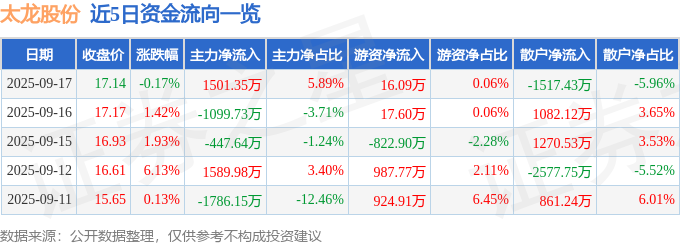 证券之星消息,截至2025年9月17日收盘,太龙股份(300650)报收于17.14元,下跌0.17%,换手率8.73%,成交量14.87万手,成交额2.55亿元。