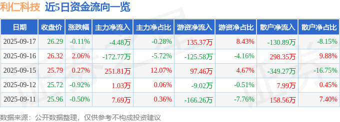 证券之星消息,截至2025年9月17日收盘,利仁科技(001259)报收于26.29元,下跌0.11%,换手率1.28%,成交量6069.0手,成交额1605.2万元。
