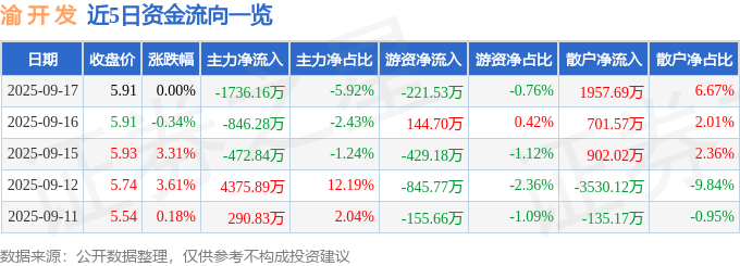 证券之星消息,截至2025年9月17日收盘,渝 开 发(000514)报收于5.91元,上涨0.0%,换手率5.93%,成交量50.07万手,成交额2.93亿元。