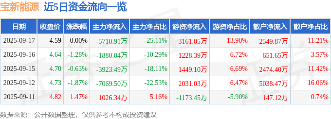 证券之星消息,截至2025年9月17日收盘,宝新能源(000690)报收于4.59元,上涨0.0%,换手率2.28%,成交量49.6万手,成交额2.27亿元。