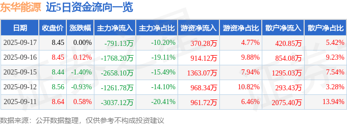 证券之星消息,截至2025年9月17日收盘,东华能源(002221)报收于8.45元,上涨0.0%,换手率0.63%,成交量9.18万手,成交额7758.02万元。
