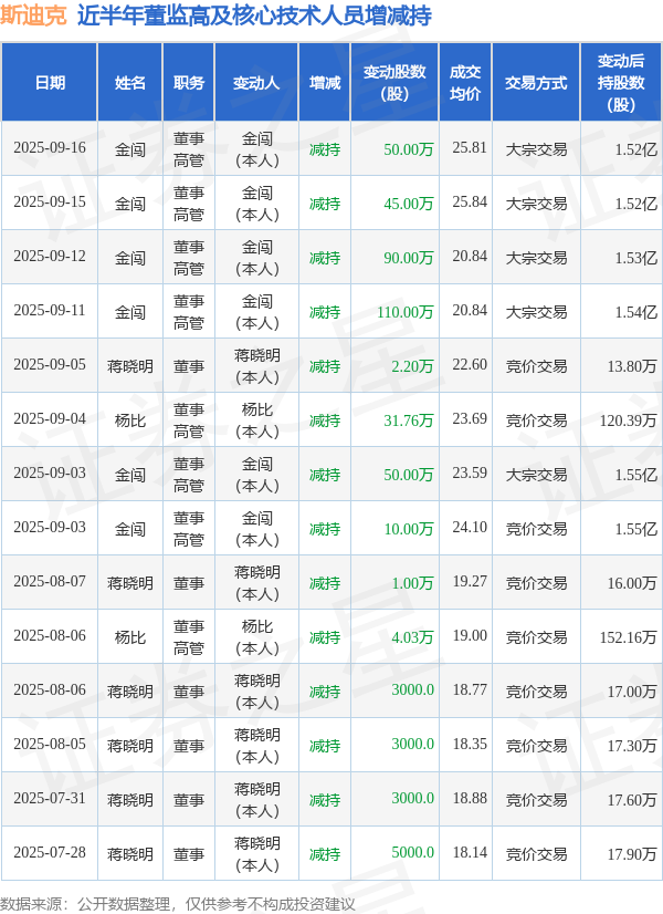 斯迪克近半年内的董监高及核心技术人员增减持详情如下: