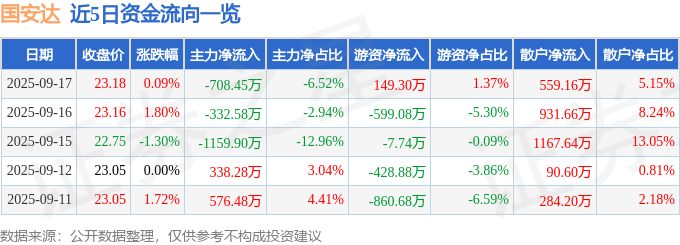 证券之星消息,截至2025年9月17日收盘,国安达(300902)报收于23.18元,上涨0.09%,换手率3.87%,成交量4.69万手,成交额1.09亿元。