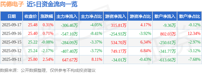 证券之星消息,截至2025年9月17日收盘,民德电子(300656)报收于25.48元,上涨0.31%,换手率2.23%,成交量2.97万手,成交额7567.8万元。