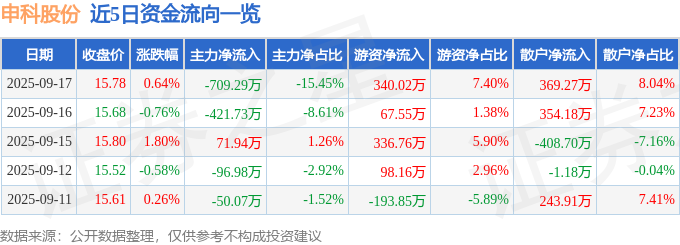 证券之星消息,截至2025年9月17日收盘,申科股份(002633)报收于15.78元,上涨0.64%,换手率1.94%,成交量2.91万手,成交额4592.23万元。