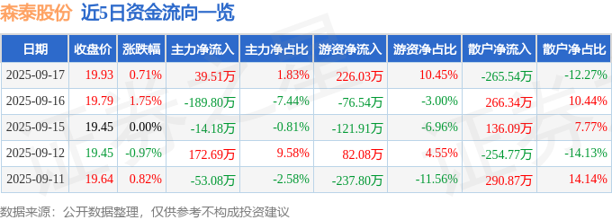 证券之星消息,截至2025年9月17日收盘,森泰股份(301429)报收于19.93元,上涨0.71%,换手率2.46%,成交量1.08万手,成交额2163.42万元。