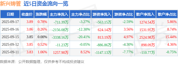 证券之星消息,截至2025年9月17日收盘,新兴铸管(000778)报收于3.89元,上涨0.78%,换手率1.44%,成交量56.15万手,成交额2.17亿元。
