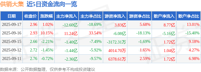 9月17日的资金流向数据方面,主力资金净流出12.6亿元,占总成交额18.69%,游资资金净流入3.83亿元,占总成交额5.68%,散户资金净流入8.77亿元,占总成交额13.01%。