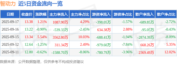 证券之星消息,截至2025年9月17日收盘,智动力(300686)报收于13.38元,上涨1.21%,换手率9.81%,成交量19.01万手,成交额2.54亿元。