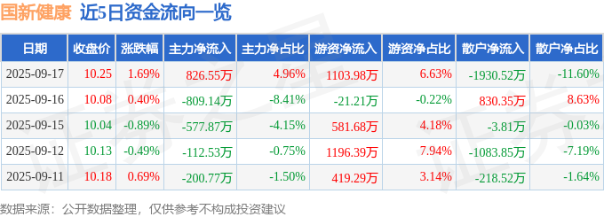 证券之星消息,截至2025年9月17日收盘,国新健康(000503)报收于10.25元,上涨1.69%,换手率1.68%,成交量16.41万手,成交额1.66亿元。