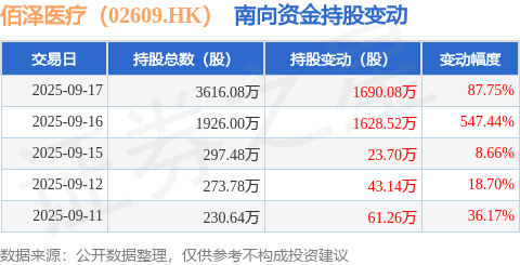 证券之星消息,9月17日南向资金增持1690.08万股佰泽医疗(02609.HK)。近5个交易日中,获南向资金增持的有5天,累计净增持3446.7万股。截至目前,南向资金持有佰泽医疗(02609.HK)3616.08万股,占公司已发行普通股的2.73%。
