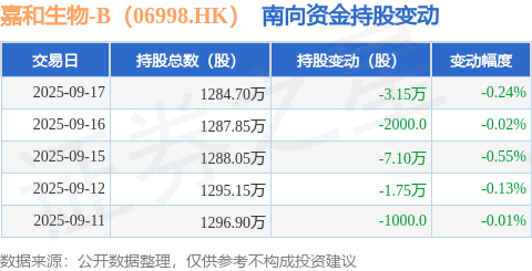 证券之星消息,9月17日南向资金减持3.15万股嘉和生物-B(06998.HK)。近5个交易日中,获南向资金减持的有5天,累计净减持12.3万股。近20个交易日中,获南向资金减持的有20天,累计净减持252.9万股。截至目前,南向资金持有嘉和生物-B(06998.HK)1284.7万股,占公司已发行普通股的2.43%。