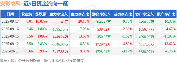 证券之星消息,截至2025年9月17日收盘,安彩高科(600207)报收于6.01元,上涨10.07%,涨停,换手率11.35%,成交量123.67万手,成交额7.22亿元。