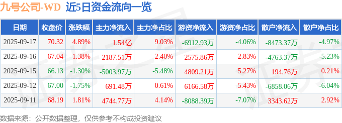证券之星消息,截至2025年9月17日收盘,九号公司(689009)报收于70.32元,上涨4.89%,换手率4.43%,成交量24.4万手,成交额17.04亿元。