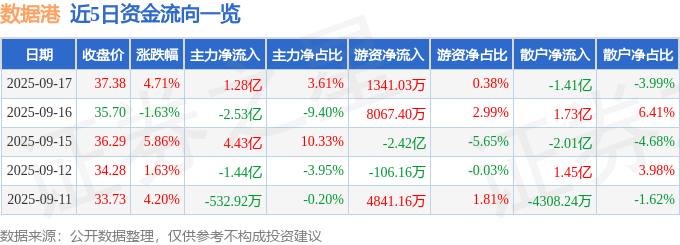证券之星消息,截至2025年9月17日收盘,数据港(603881)报收于37.38元,上涨4.71%,换手率13.45%,成交量96.61万手,成交额35.4亿元。