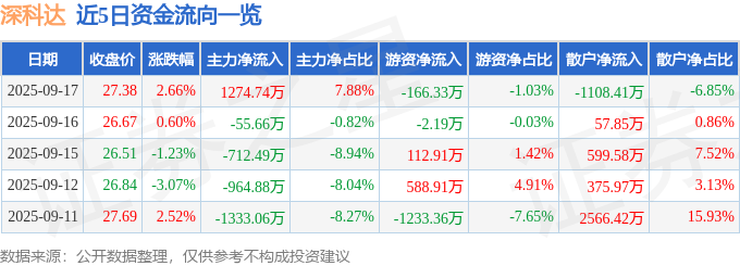 证券之星消息,截至2025年9月17日收盘,深科达(688328)报收于27.38元,上涨2.66%,换手率6.2%,成交量5.86万手,成交额1.62亿元。