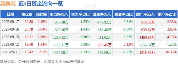 9月17日的资金流向数据方面,主力资金净流出337.38万元,占总成交额1.53%,游资资金净流出177.92万元,占总成交额0.81%,散户资金净流入515.3万元,占总成交额2.33%。