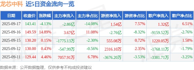 证券之星消息,截至2025年9月17日收盘,龙芯中科(688047)报收于143.41元,下跌4.13%,换手率3.52%,成交量14.12万手,成交额20.3亿元。