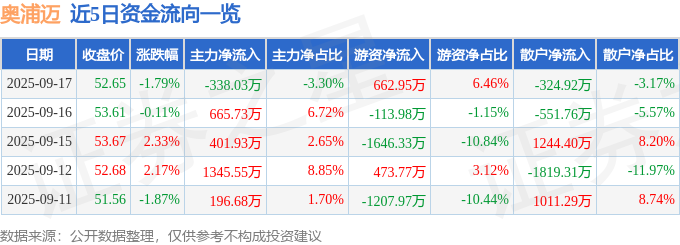 证券之星消息,截至2025年9月17日收盘,奥浦迈(688293)报收于52.65元,下跌1.79%,换手率1.72%,成交量1.95万手,成交额1.03亿元。