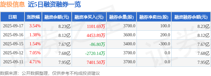旋极信息融资融券信息显示,融资方面,当日融资买入2.11亿元,融资偿还2.0亿元,融资净买入1101.69万元。融券方面,融券卖出100.0股,融券偿还0.0股,融券余量3700.0股,融券余额2.82万元。融资融券余额8.23亿元。