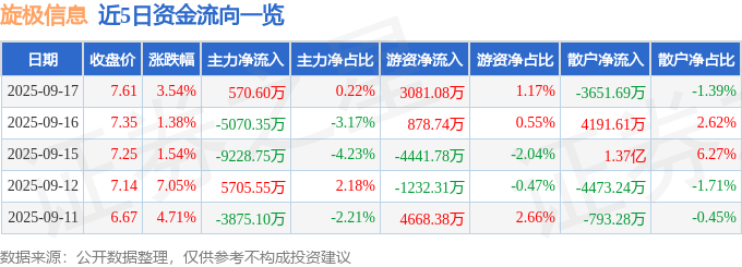 证券之星消息,截至2025年9月17日收盘,旋极信息(300324)报收于7.61元,上涨3.54%,换手率20.24%,成交量346.18万手,成交额26.24亿元。