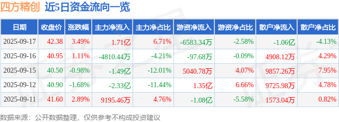 证券之星消息,截至2025年9月17日收盘,四方精创(300468)报收于42.38元,上涨3.49%,换手率11.42%,成交量60.48万手,成交额25.53亿元。