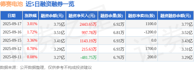 德赛电池融资融券信息显示,融资方面,当日融资买入9563.6万元,融资偿还7119.95万元,融资净买入2443.65万元,连续3日净买入累计4584.62万元。融券方面,融券卖出1100.0股,融券偿还0.0股,融券余量6.92万股,融券余额193.97万元。融资融券余额3.77亿元。