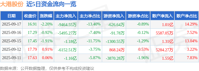 证券之星消息,截至2025年9月17日收盘,大港股份(002077)报收于16.91元,下跌2.2%,换手率7.11%,成交量41.29万手,成交额7.06亿元。