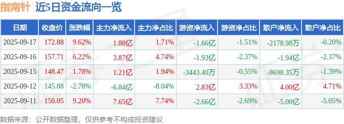 证券之星消息,截至2025年9月17日收盘,指南针(300803)报收于172.88元,上涨9.62%,换手率11.1%,成交量66.42万手,成交额109.78亿元。