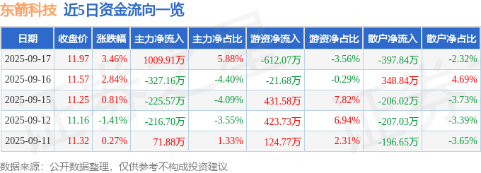 证券之星消息,截至2025年9月17日收盘,东箭科技(300978)报收于11.97元,上涨3.46%,换手率7.56%,成交量14.46万手,成交额1.72亿元。