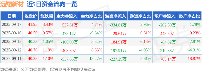 证券之星消息,截至2025年9月17日收盘,远翔新材(301300)报收于41.95元,上涨3.43%,换手率8.74%,成交量2.7万手,成交额1.13亿元。