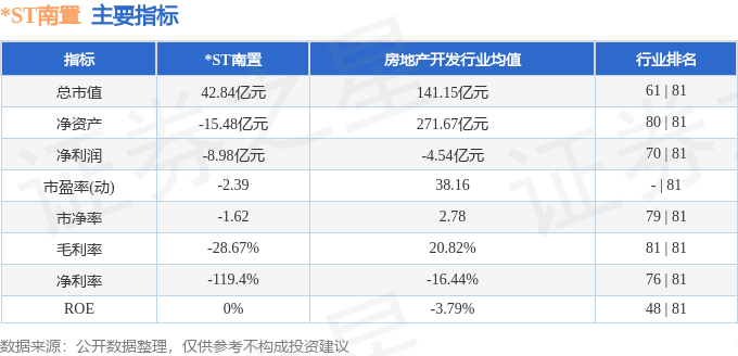 *ST南置主要指标及行业内排名如下: