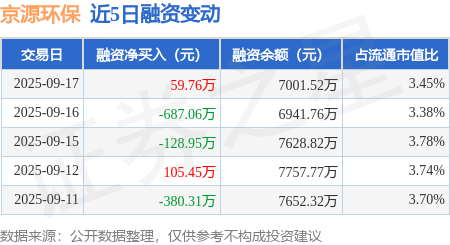 证券之星消息,9月17日,京源环保(688096)融资买入308.23万元,融资偿还248.46万元,融资净买入59.76万元,融资余额7001.52万元。