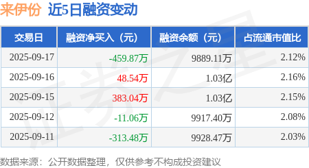 证券之星消息,9月17日,来伊份(603777)融资买入2211.52万元,融资偿还2671.39万元,融资净卖出459.87万元,融资余额9889.11万元。