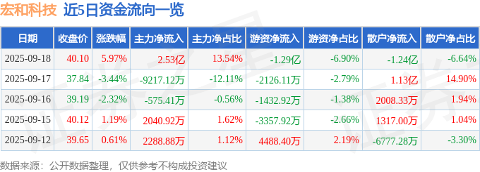 证券之星消息,截至2025年9月18日收盘,宏和科技(603256)报收于40.1元,上涨5.97%,换手率5.26%,成交量46.26万手,成交额18.68亿元。