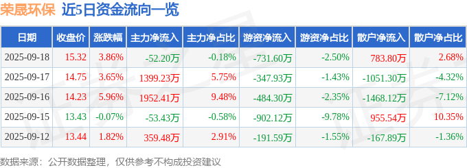 证券之星消息,截至2025年9月18日收盘,荣晟环保(603165)报收于15.32元,上涨3.86%,换手率6.96%,成交量18.98万手,成交额2.92亿元。