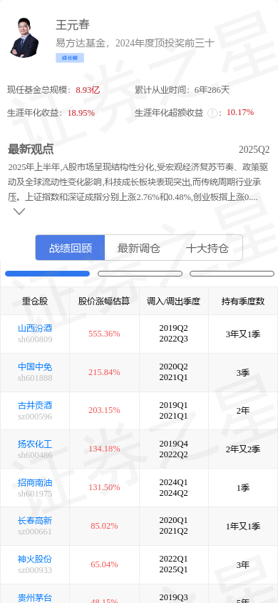中国财险(02328)是基金大佬王元春的重仓股。,其在整个职业生涯内年化收益高达18.95%。王元春的大佬持仓 - 战绩回顾截图如下: