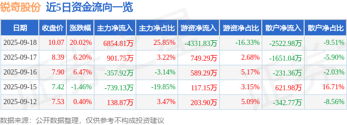 证券之星消息,截至2025年9月18日收盘,锐奇股份(300126)报收于10.07元,上涨20.02%,涨停,换手率12.98%,成交量27.34万手,成交额2.65亿元。