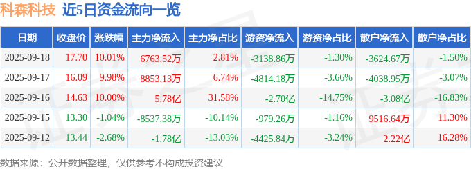证券之星消息,科森科技9月18日涨停收盘,收盘价17.7元。该股于9点35分涨停,7次打开涨停,截止收盘封单资金为4263.29万元,占其流通市值0.43%。